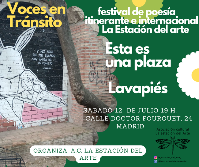 El próximo viernes, 12 de julio, a las 19 horas, el espacio vecinal Esta es una Plaza acoge un encuentro poético abierto, libre y diverso: “Voces en Tránsito – Poesía Itinerante”. Este evento se inspira en el Festival Internacional e Itinerante de Poesía promovido por la Asociación Cultural La Estación del Arte, un proyecto que desde 2020 recorre ciudades de España e Italia llevando la poesía a distintos territorios, espacios y comunidades. La parada en Madrid busca revivir la esencia del festival: la palabra en movimiento, el encuentro entre voces diversas y el compromiso con una cultura viva, libre y compartida. En Esta es una Plaza se darán cita poetas, vecinas y visitantes para compartir sus voces en una propuesta de micrófono abierto. La dirección artística del evento está a cargo de Inés Negro, cofundadora del festival junto a Desirée Monfreda, también fundadora y jurado del certamen. La producción está coordinada por el productor Christopher Reyna. Dónde: Esta es una Plaza, calle Doctor Fourquet, 24 Cuándo: viernes, 12 de julio, a las 19 horas